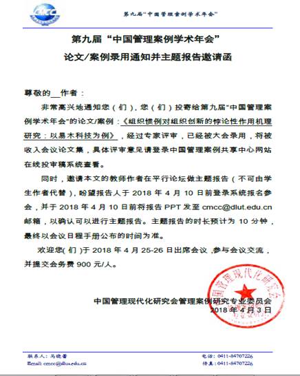 本人认真听取和学习了24号管理学专家吴晓波教授、苏敬勤教授、周长辉教授等做的学术报告,并作为平行论坛的召集人主持了第一平行论坛,同时做了题为“组织惯例对组织创新的悖论性作用机理”的研究报告,该论文获学术年会优秀论文一等奖。