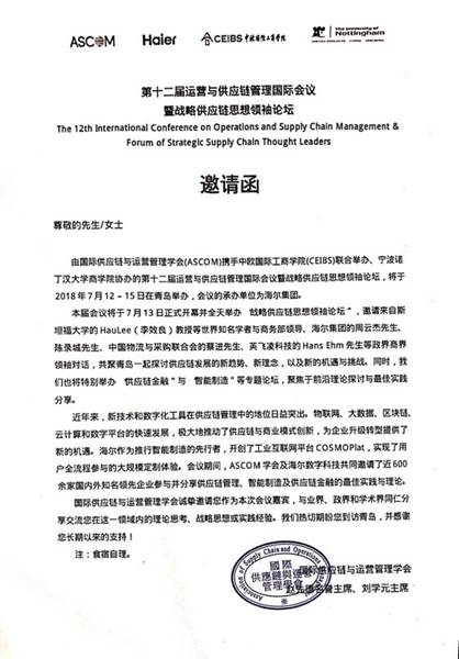 本次会议由国际供应链运营管理学会和中欧国际工商学院主办,宁波诺丁汉大学商学院协办,由海尔集团协办。会议同时邀请了商界、政界和学术界的知名人士和思想领袖,探讨了供应链发展的新趋势、新理念以及新的机遇和挑战。