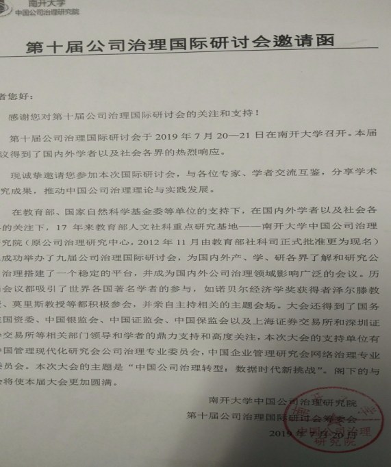 由南开大学商学院、南开大学中国公司治理研究院、天津财经大学商学院、天津财经大学中国公司治理研究院、中国特色社会主义经济建设协同创新中心共同主办的2019第十届公司治理国际研讨会于7月20日至21日在天津召开。