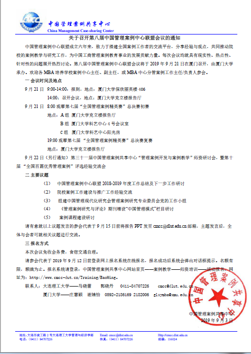 会议简况:中国管理案例中心联盟成立六年来,致力于搭建全国案例工作者的交流平台,分享经验与观点,共同推动院校的案例教学与研究工作,为中国工商管理案例教育事业的发展贡献力量。每次会议均就具有现实性、热点性、针对性的问题展开热烈讨论。第八届中国管理案例中心联盟会议将于2019年9月21日在厦门召开,由厦门大学承办。欢迎各MBA培养学校案例中心主任、副主任,或MBA中心分管案例工作主任/负责人参会。