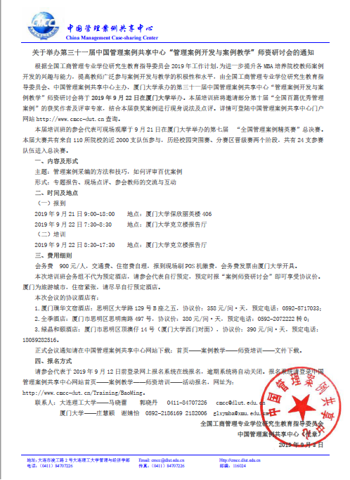 根据全国工商管理专业学位研究生教育指导委员会2019年工作计划,为进一步提升各MBA培养院校教师案例开发的兴趣与能力,提高教师广泛参与案例开发与教学的积极性和水平,由全国工商管理专业学位研究生教育指导委员会、中国管理案例共享中心主办,厦门大学承办的第三十一届中国管理案例共享中心“管理案例开发与案例教学”师资研讨会将于2019年9月22日在厦门大学举办。本届培训班将邀请部分第十届“全国百篇优秀管理案例”的获奖作者及评审专家,结合本届获奖案例进行现身说法及点评。