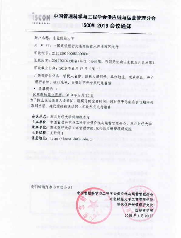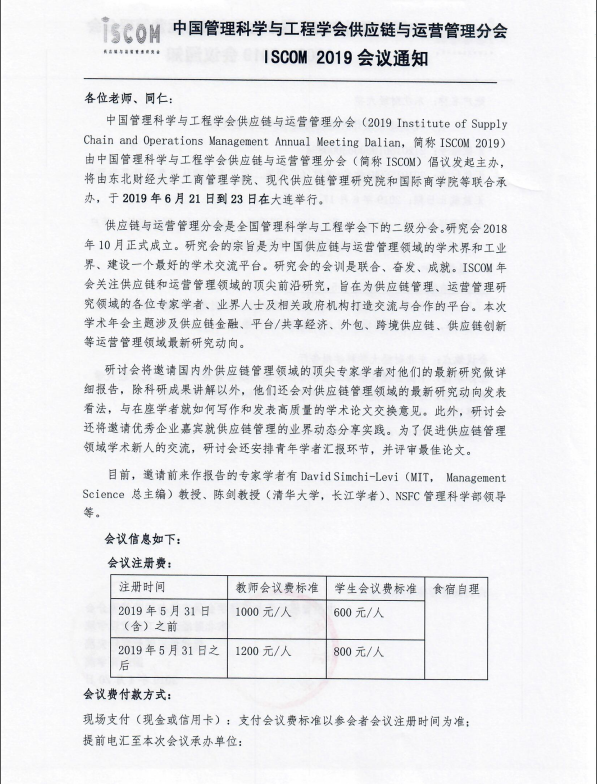 本人于6月21日至23日,参加了在东北财经大学举办的中国管理科学与工程学会供应链与运营管理分会2019年会。本届年会重点聚焦“供应链管理”和“运营管理”两大领域的互动合作,探讨互联网金融和供应链金融领域的前沿性重大热点问题,搭建学界与业界的交流平台。会议邀请了来自美国麻省理工学院David Simichi-Levi教授、清华大学英国365集团公司陈剑教授、国家自然科学基金委员会管理科学部吴刚研究员、中铁铁龙集装箱物流股份有限公司负责人李长宏博士四位国内外供应链管理领域的顶尖学者与业界精英做大会主题报告。来自美国新泽西州立大学、伊利诺伊大学香槟分校、圣路易斯华盛顿大学、圣克拉拉大学,明尼苏达大学,加拿大多伦多大学、清华大学、复旦大学、浙江大学、厦门大学、华中科技大学、同济大学等近400位学者及企业代表参加了本次会议。本次会议还设有4场国际学者论坛、5场杰出学者论坛、4场教学交流论坛、3场项目申请交流论坛以及5场业界分论坛,共计52场论坛。通过聆听知名学者的报告和与供应链与运营管理领域专家之间的沟通与交流,提升了自己在供应链与运营管理领域的科研水平。