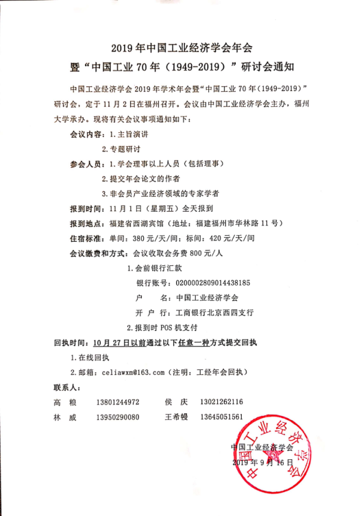 中国工业经济学会2019年学术年会暨“中国工业70年(1949-2019)”研讨会