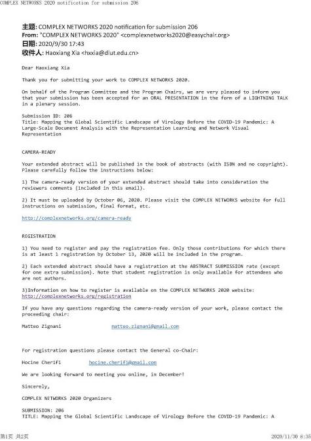 复杂网络与应用国际会议是国际复杂网络学界的主要学术交流平台之一,由牛津大学机构发起,为年度系列会议。今年会议原定于西班牙马德里举办,由于疫情原因移到线上进行。