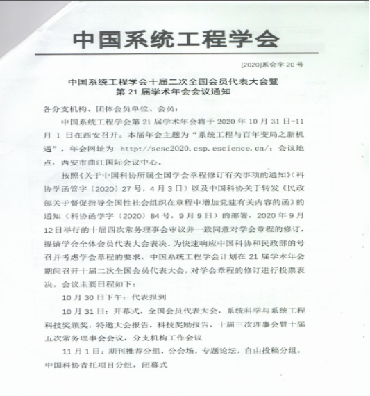 中国系统工程学会第21届学术年会将于2020年10月31日-11月1日在西安召开。本届年会主题为“系统工程与百年变局之新机遇”。