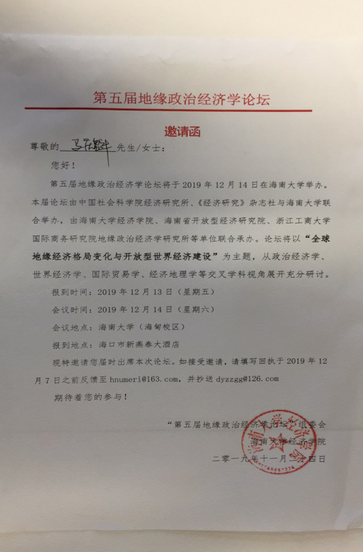 12月14日由中国社会科学院经济研究所、《经济研究》杂志社、海南大学联合主办,海南大学经济学院、海南省开放型经济研究院、浙江工商大学国际商务研究院、地缘政治经济学研究所联合承办的第五届地缘政治经济学论坛在海南大学隆重召开,会议主题为“全球地缘经济格局变化与开放型世界经济建设”。会议期间来自中国社会科学院、国务院发展研究中心、美国伊利诺伊州立大学、北京大学、武汉大学、南京大学、四川大学、山东大学、西北大学、南开大学、华东师范大学、外交学院、对外经济贸易大学、中央财经大学、东北财经大学、辽宁大学、河南财经政法大学、广东外语外贸大学、上海对外经贸大学、安徽财经大学、山西财经大学、英国365集团公司、大连海事大学、南京农业大学、河南大学、中国石油大学(北京)、海南大学、浙江工商大学、哈尔滨理工大学、哈尔滨商业大学、四川农业大学、浙江师范大学、海南师范大学和黑龙江社会科学院等30多所高校和科研机构的120余位专家学者,通过听取主题报告、分组讨论等形式进行了充分的学术交流。