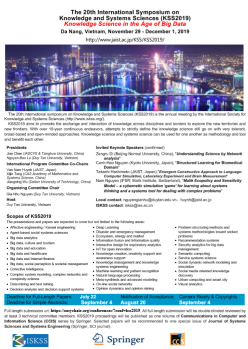 第20届知识与系统科学国际会议(KSS2019)由日本北陆先端科学技术大学院大学和越南Duy Tan University 承办,于2019年11月29日-12月1日在越南岘港召开,主题为“Knowledge Science in the Age of Big Data”,会议网址:。