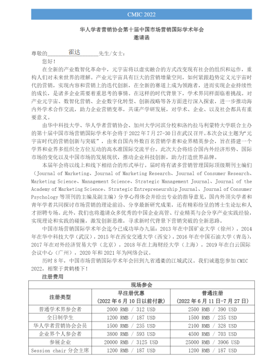 会议简况:会议由华中科技大学、华人学者营销协会、加州大学河滨分校和洛约拉马利蒙特大学联合主办的第十届中国市场营销国际学术年会将于2022年7月27-30日在武汉召开。本次会议主题为“元宇宙时代的营销创新与突破”,由来自国内外数百名营销学者和业界精英参会,旨在搭建一个学界和业界多组织全方位互动的高水准国际交流平台。此次大会将结合国内外经济形势、国际市场的变化以及中国市场的发展现状,推动企业科技创新,助力打造世界品牌。