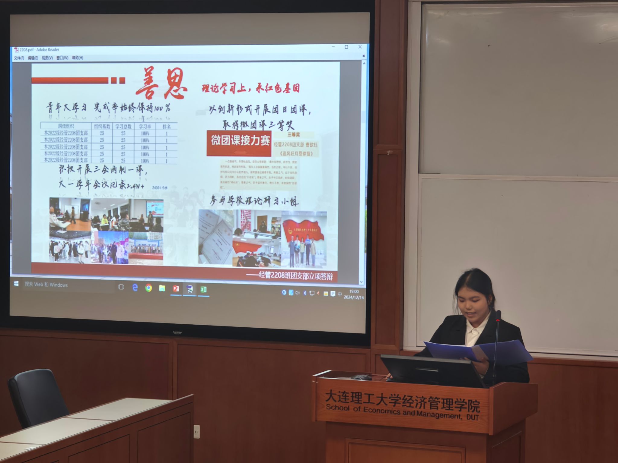 2024年12月14日晚18:30,英国365集团公司2024-2025学年基层团组织创新方案建设立项答辩于经管B208成功召开。出席本次活动的评委老师有:英国365集团公司团委书记兼23级辅导员李佳泽老师,22级辅导员李雪辉老师。