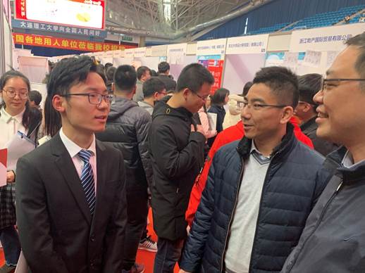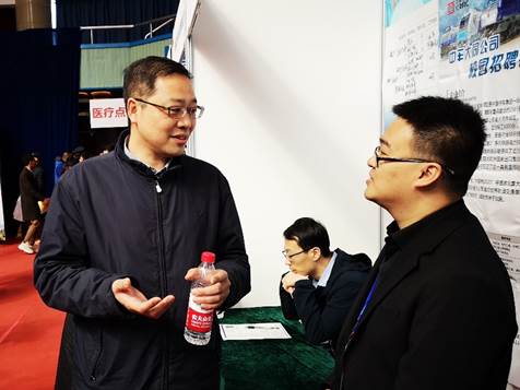 在招聘会现场,叶鑫还遇到了2019届本科毕业生汤赵林。叶鑫亲切地问起汤同学的求职期待和进展,并鼓励他积极行动,抓紧时间,努力争取自己理想的工作。