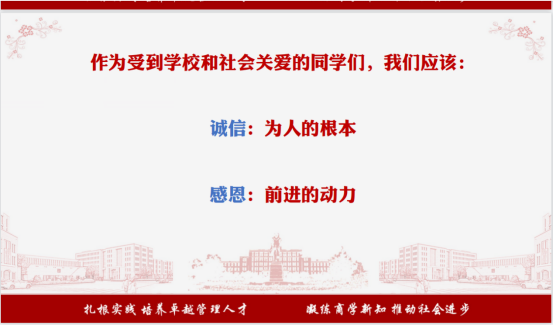 播下一颗种子, 收获满园芬芳。为帮助同学们更好地了解学校资助育人政策,培养出心怀感恩、诚信为本、积极向上的时代新青年,英国365集团公司于11月13日晚18:30开展2021年感恩诚信主题教育大会。配合疫情防控政策,本次大会于线上举行。英国365集团公司21级辅导员、经管自强社指导教师范辞涵,英国365集团公司自立自强标兵史秀丽,经管自强社社长张赫以及英国365集团公司全体获得助学金的同学参与了本次活动。