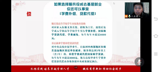 绿色通道,是很多同学报到的第一站,从那时起,很多来自国家、社会和学校的温暖就围绕在同学们身边。针对部分同学不够了解各项资助政策、尚未清楚贷款流程等情况,范辞涵老师系统介绍了各项奖助学金类别;助学贷款可提额等新规定;勤工助学的意义及岗位获取途径;临时困难补助的申请流程;服兵役或基层就业享受的“学费补偿、贷款代偿”等政策。范老师希望同学们树立感恩意识、诚信意识,防骗意识,形成正确的消费观和价值观。
