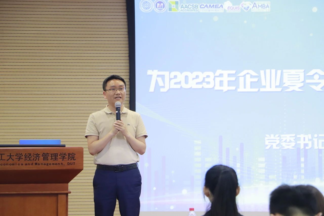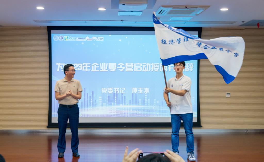 紧接着,学院党委书记孙玉涛为2023年企业行夏令营启动授旗并致辞。孙老师表示,期待同学们能把课本上学到的和从企业中看到的结合起来,多积极思考,并对今年的企业行团队寄予期望。