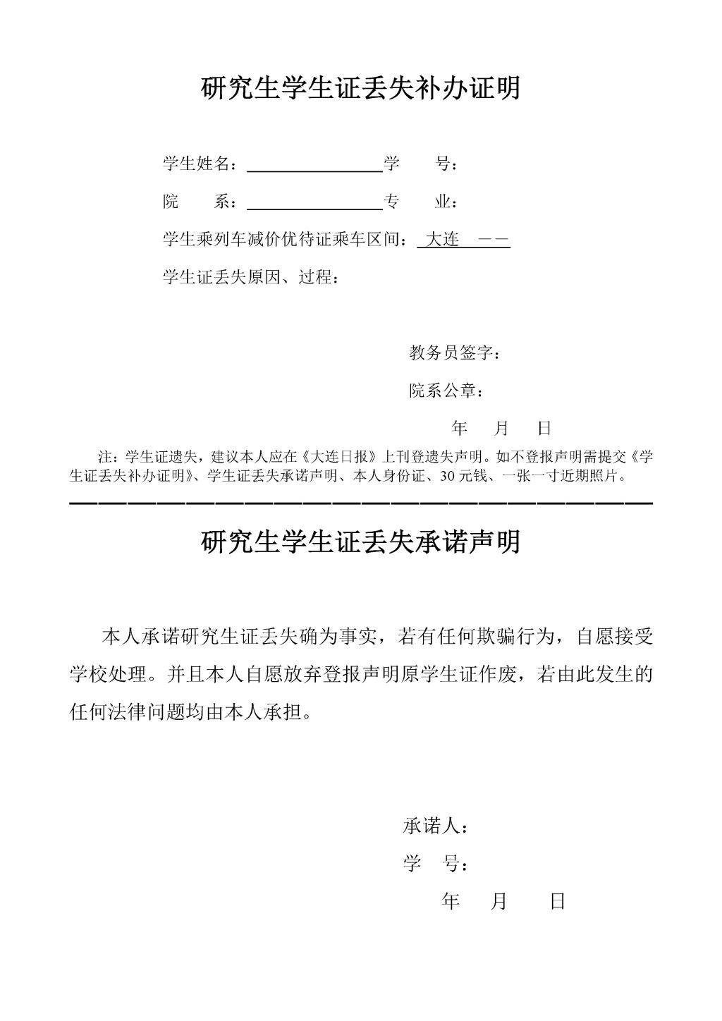 研究生学生证丢失补办证明及丢失承诺声明