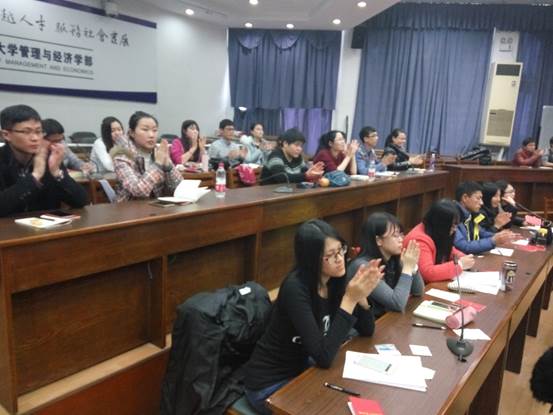 刁成璟校友先从2011年参加飞利浦公司“论道”会议说起,这次会议设置了主题演讲环节。当他在熟悉场地的时候,会议的承办负责人说“刁先生,您一定不会成为第一名,因为这里有清华、北大的MBA。”他笑了笑,没有反驳什么。最终的结果是他夺得了第一名,而那位负责人也给他以掌声。他和在校生说,他一直为自己是大工管理学院的学生而骄傲,也一直用这一点鼓舞自己、激励自己。