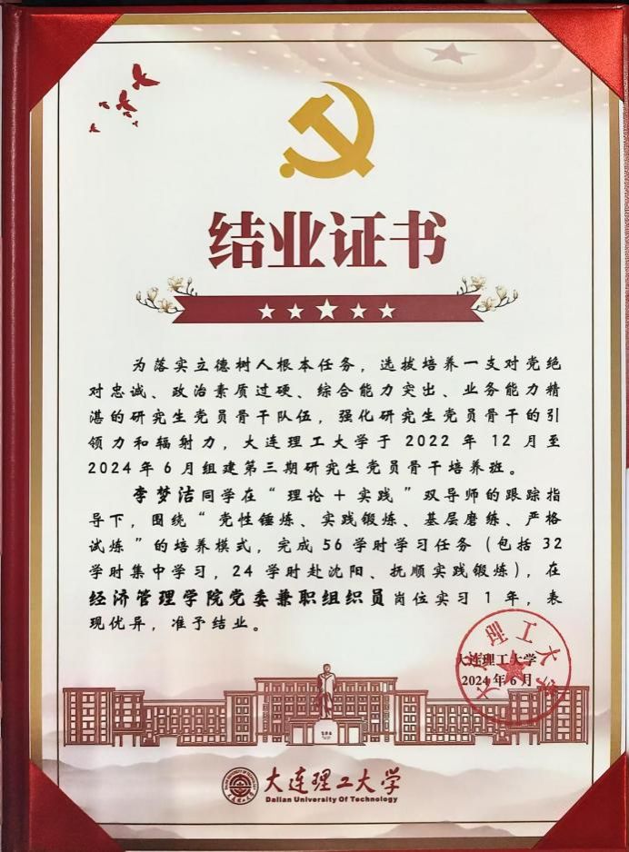 她说:“只有真正站在历史的土地上,才能读懂信仰的分量;只有走近那些为国为民的人,才能更坚定为何而奋斗。”在理论学习结束后,李梦洁主动承担学院兼职组织员的岗位,将所学所思落实于组织服务实践之中,继续在工作中锤炼党性、坚定理想。