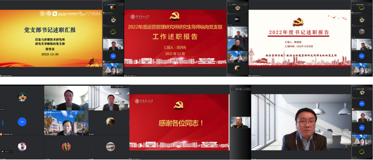 会上,信息与决策技术研究所研究生导师纵向党支部书记陈雪龙、运营管理研究所研究生导师纵向党支部书记薄洪光、旅游与环境管理研究所研究生导师纵向党支部委员陈德湖围绕党支部总体情况、上年度述职查摆问题整改落实情况和当前存在问题与改进思路举措等方面依次现场述职,联系该支部的学院班子成员和党委书记分别进行点评。其余各支部书记进行了书面述职。