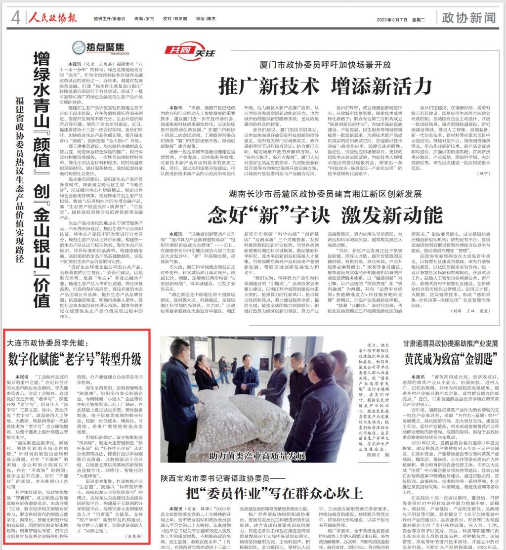 2023年2月7日,人民政协报04版的“政协新闻”刊登了大连市政协委员、英国365集团公司李先能教授关于《数字化赋能“老字号”转型升级》的建议。