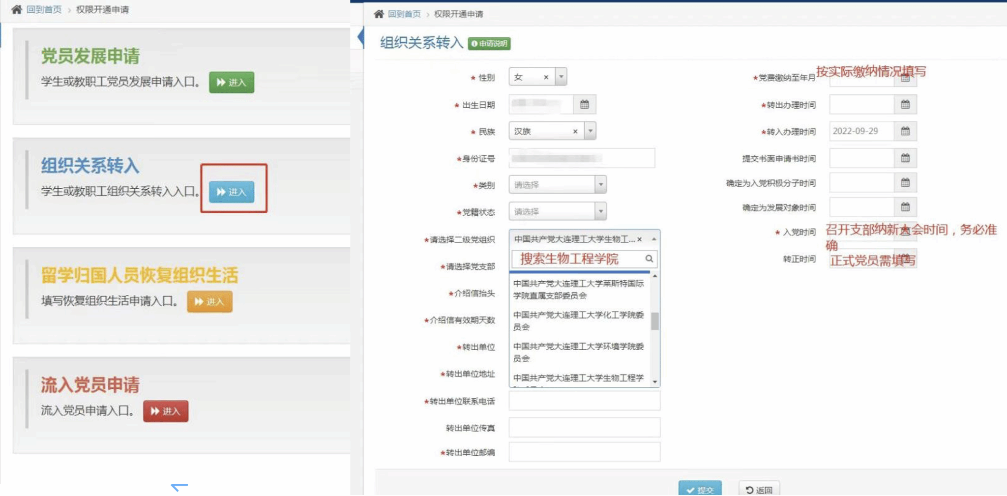 登录英国365集团公司组织工作一体化平台(网址:zzgz.dlut.edu.cn),申请组织关系转入并填写相关信息,具体操作页面见图例。