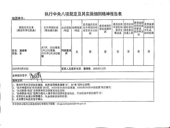 上述行程严格按照审批后的行程,执行中央八项规定及其实施细则精神报告表如下: