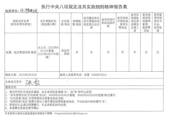 上述行程严格按照审批后的行程,执行中央八项规定及其实施细则精神报告表如下: