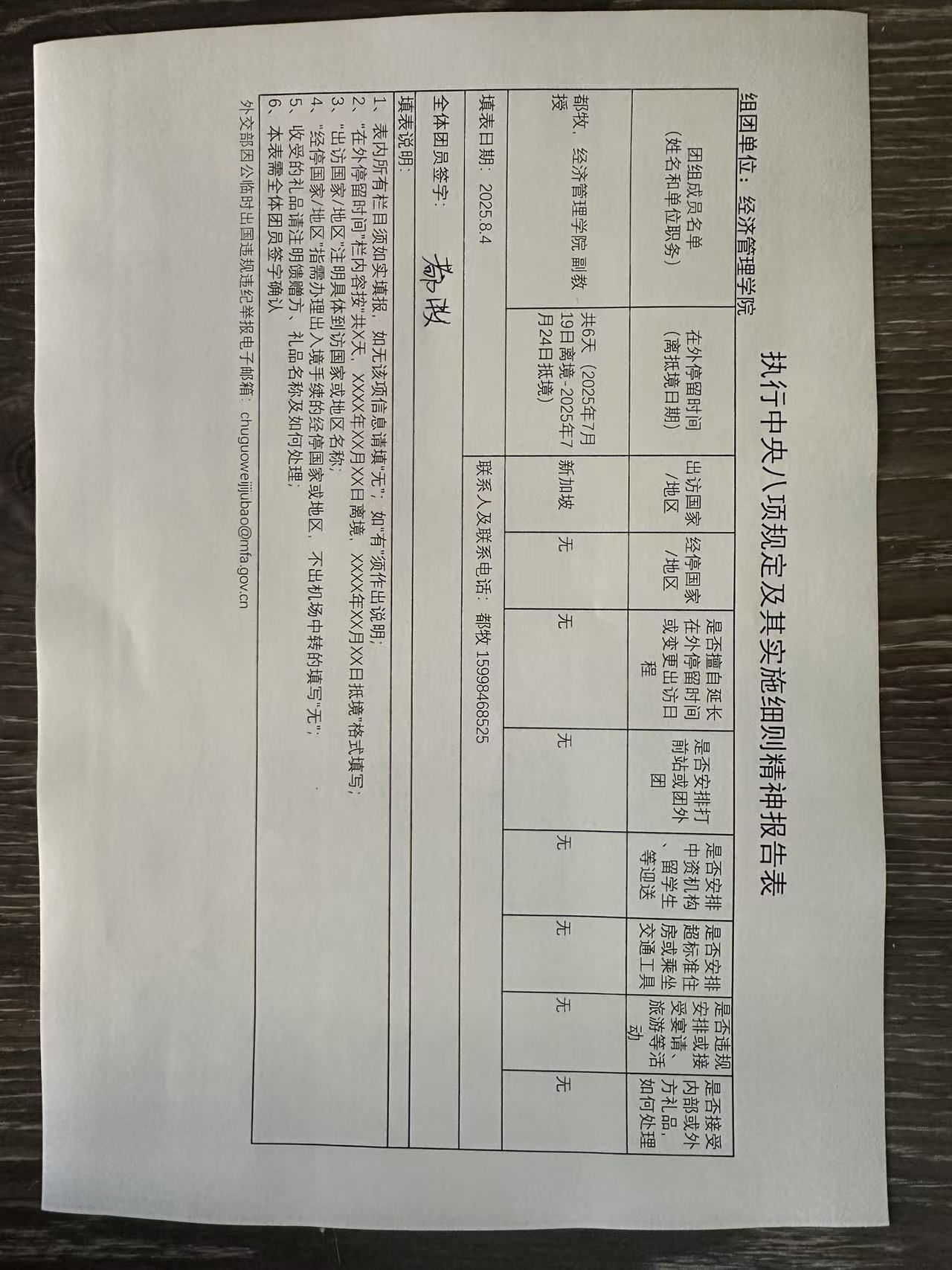 上述行程严格按照审批后的行程,执行中央八项规定及其实施细则精神报告表如下: