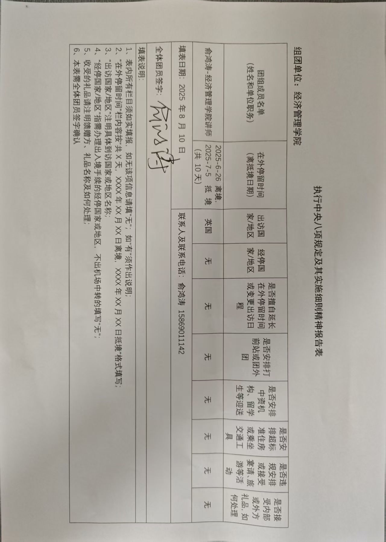 执行中央八项规定及其实施细则精神报告表