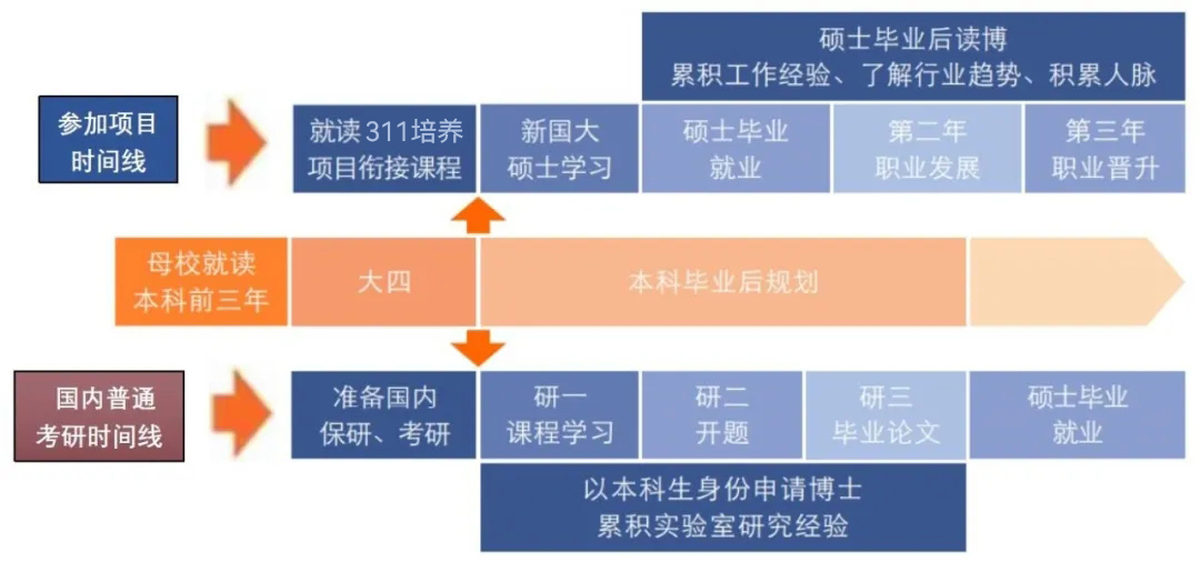 参加项目时间线:本科毕业后仅需一年即可硕士毕业,参加工作、积累工作经验与人脉,或选择继续读博深造。