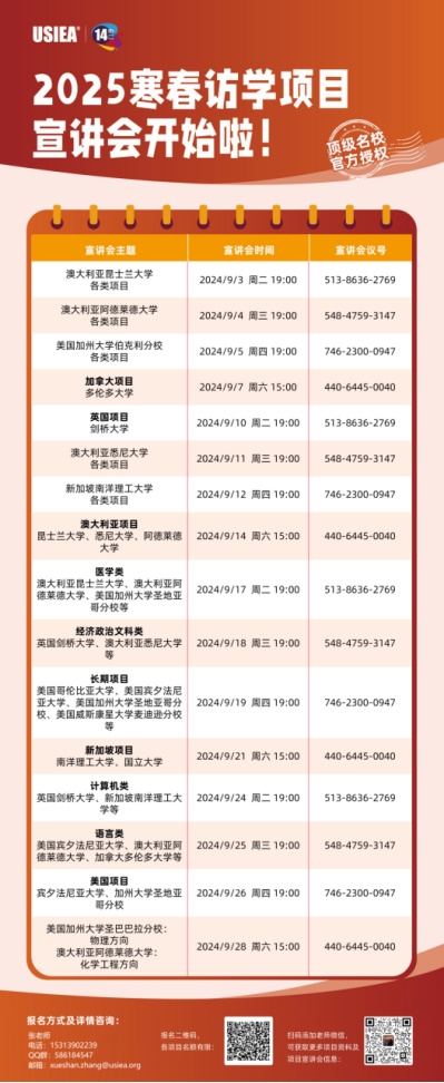 线上宣讲会将覆盖整个9月,会根据不同主题进行详细的介绍,旨在为大家提供一个全面、便捷的渠道,深入了解并规划同学们的海外访学之旅。欢迎同学们踊跃参与!