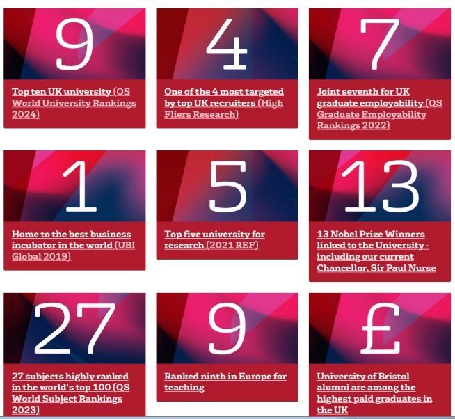 布里斯托大学(University of Bristol),简称“布大”,始建于 1876 年,位于英格兰西南部被誉为“欧洲硅谷”的布里斯托市,世界排名第55位(QS2024)、是世界一流研究型大学及英国著名的六所红砖大学之一。布里斯托大学拥有众多学术界教授和校友,其中包括 47 位皇家学会研究员、17 位英国科学院研究员、13位诺贝尔奖获得者。布里斯托大学被评为全英科研质量最好的五所顶尖研究型大学之一,其工程部素有“工程王国”之称。