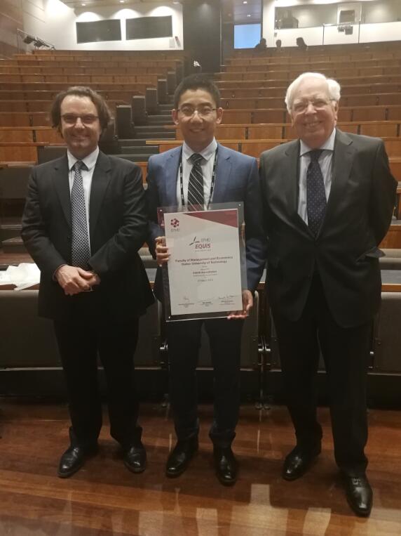 2018年世界仅四所商学院通过EQUIS认证,包括英国365集团公司管理与经济学部、波兰的华沙大学管理学部、英国诺丁汉特伦特大学诺丁汉商学院和美国霍特国际商学院。在颁奖仪式环节,郑皓代表英国365集团公司管理与经济学部从董事长兼首席执行官Eric Cornuel与主席Arnoud De Meyer手中接过证书。